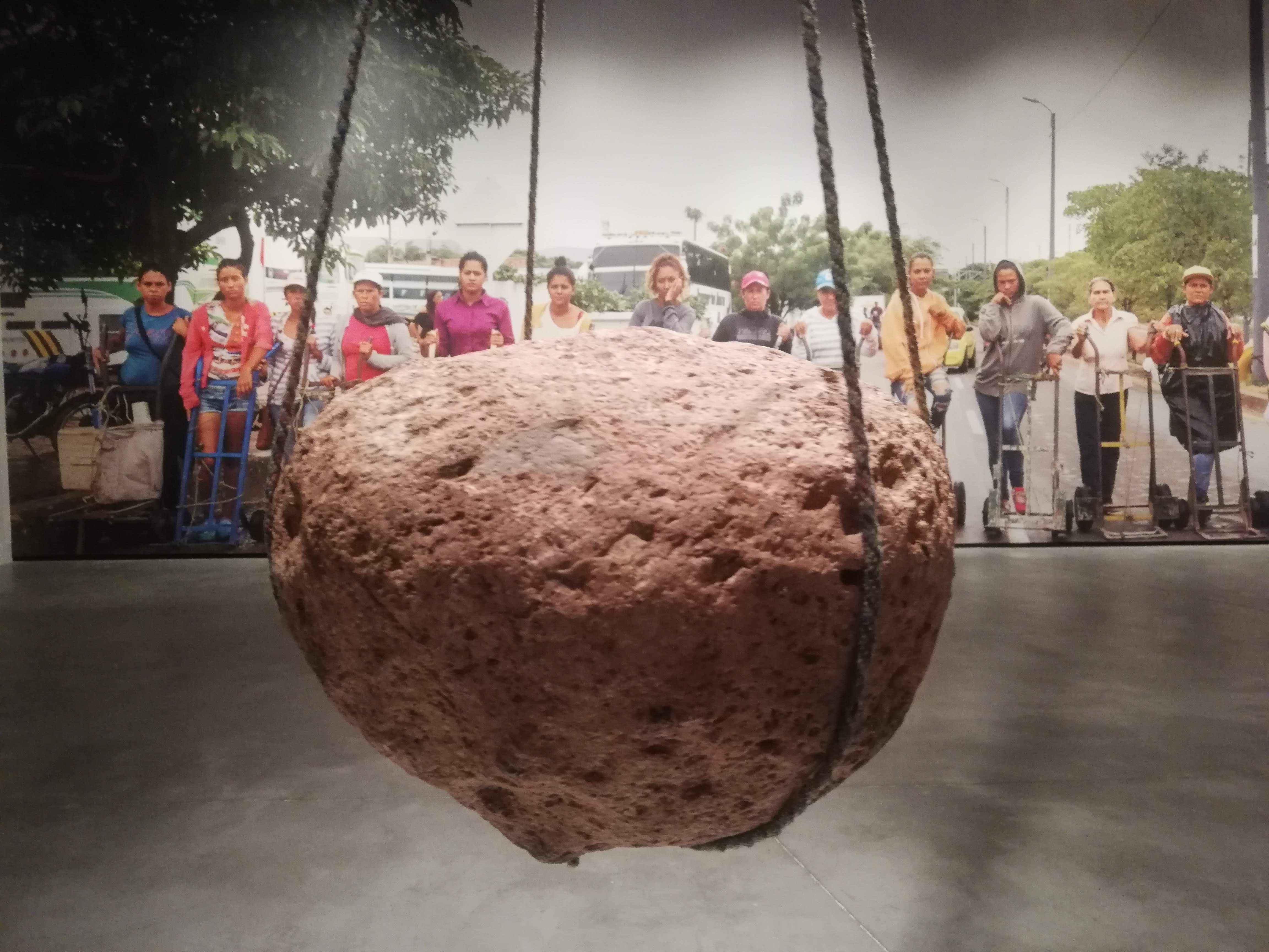 Continuamos por la sala contigua y vemos, imponente, una piedra que cuelga del centro del espacio. Atrás, una buena fotografía que documenta, precisamente, una trochera trasportando una piedra. Delante, una gran fotografía, tanto por tamaño como por calidad, en la que se ve una hilera de trocheras que posan a cámara mirando fijamente a quien quiera pararse a contemplarlas. La expectación sigue en aumento. El deseo por conocer más su historia hace que recorramos el espacio con avidez en busca de respuestas: ¿cómo es la vida de estas mujeres? ¿qué situaciones de desigualdad viven? ¿por qué se da tanta importancia a la piedra?