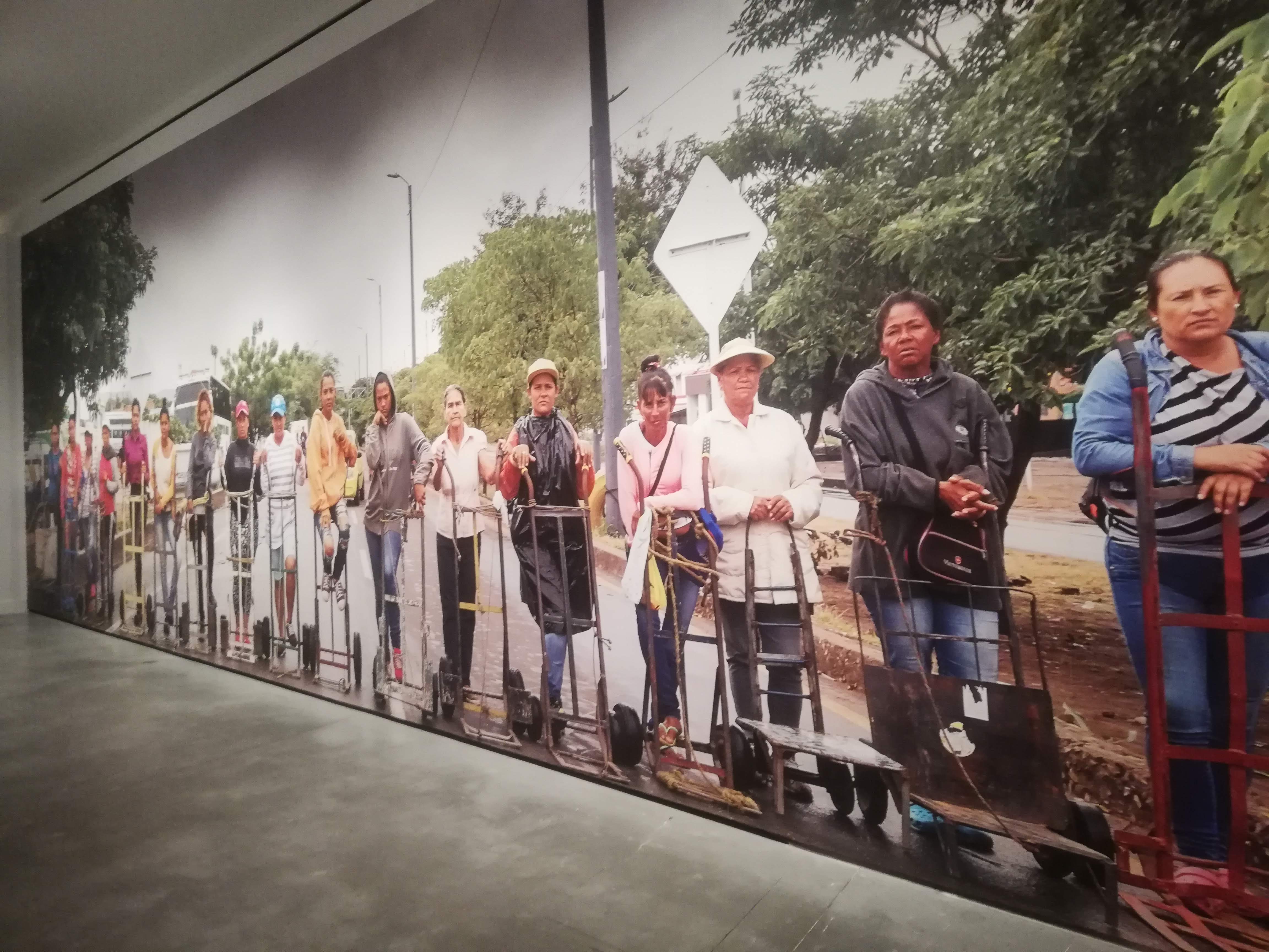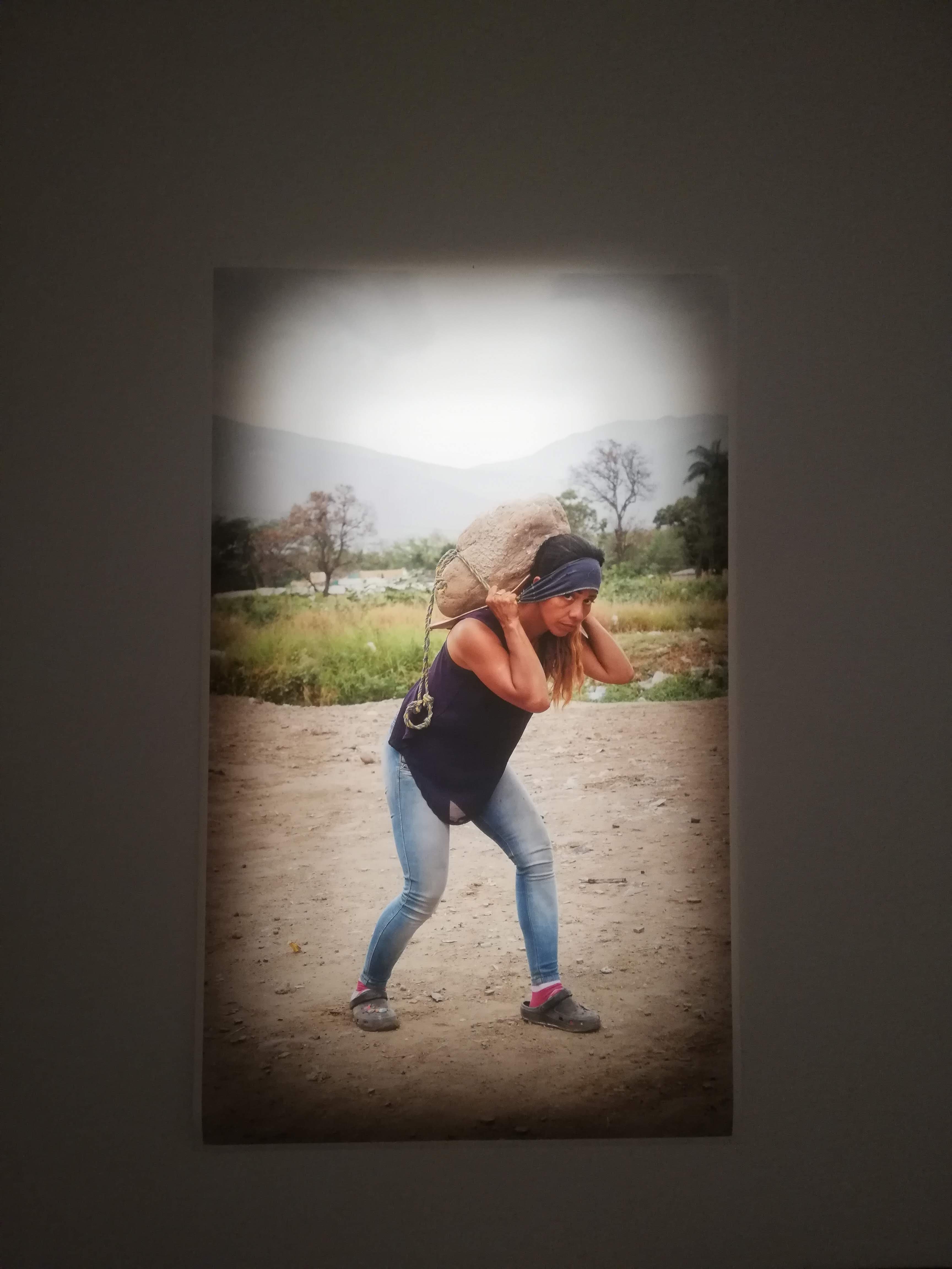 Giramos nuestra vista al lado para leer lo que la comisaria nos tiene que decir sobre la muestra, y ahí empezamos a entender un poco más que las trocheras son mujeres que se dedican a cargar mercancías o personas en la frontera entre Venezuela y Colombia, valiéndose únicamente de su propio cuerpo. Su texto nos prepara cuidadosamente para indignarnos ante una situación desigualitaria, sufrida por mujeres que deben exponer su frágil cuerpo para hacer frente a un duro trabajo.