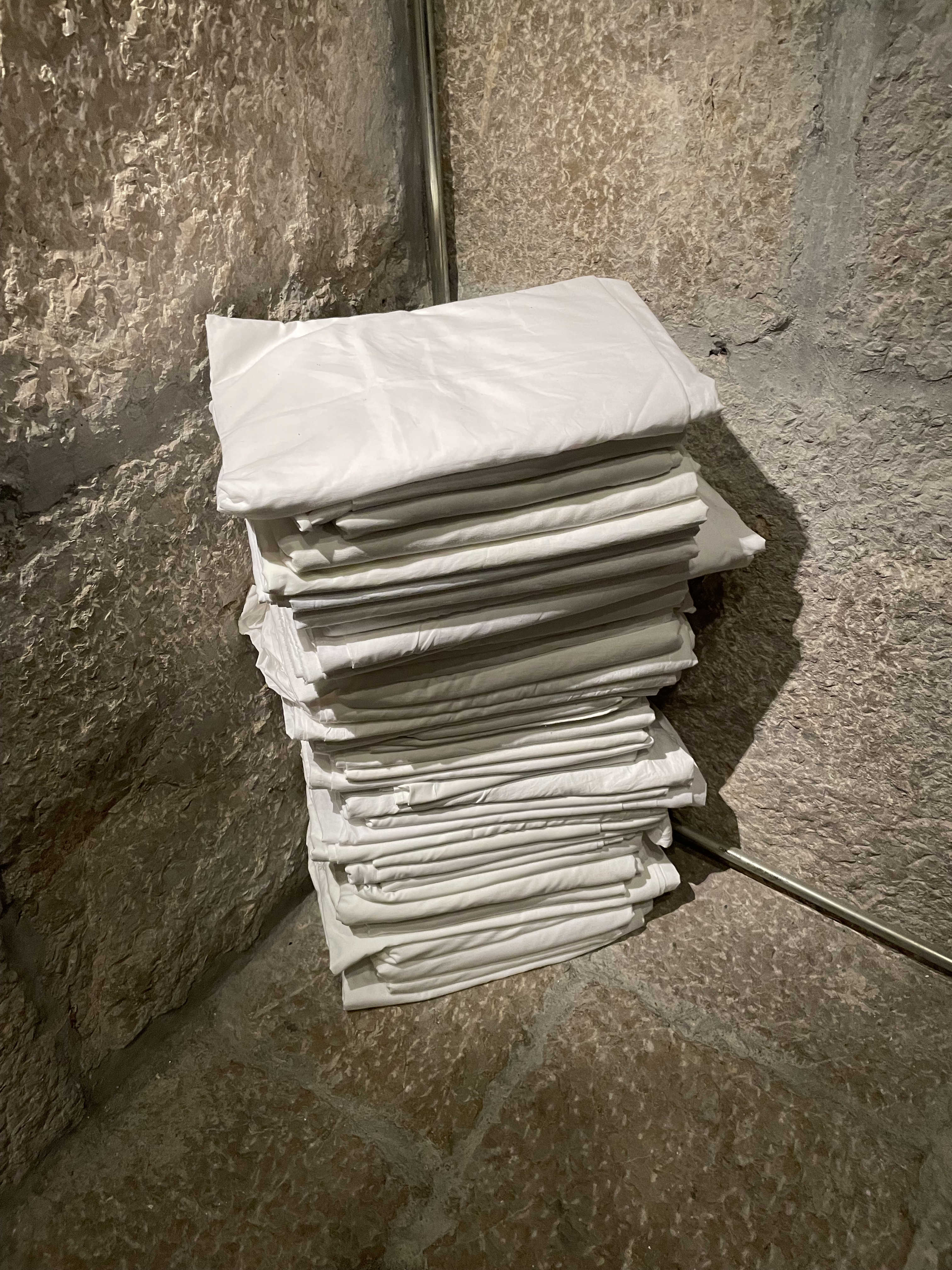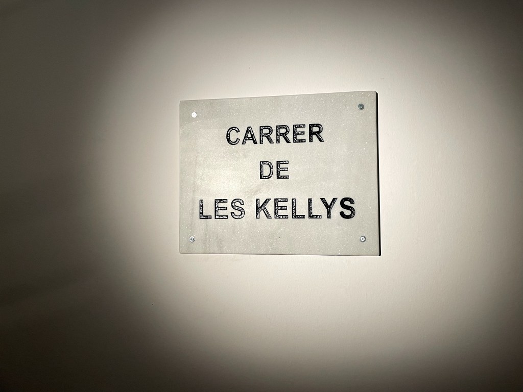En el espacio “Dipòsit” se han ubicado una serie de instalaciones ideadas para hacer reflexionar acerca del duro trabajo de estas mujeres. Sus testimonios son recogidos mediante sus propias voces, que se oyen como un rezo de estremecedoras historias vividas por ellas en el desempeño de su práctica laboral. Historias de fantasmas incluidas. La Ley de externalización en la reforma laboral del 2012, por otra parte, que empeoró sus condiciones de trabajo por facilitar la subcontratación provocando aún más precariedad entre ellas, también se sitúa en el centro expositivo como núcleo de muchas de las quejas de estas trabajadoras. Un montón de sábanas apiladas, a punto de caer, en representación de la carga laboral soportada y como metáfora de la inevitable gravedad que física y emocionalmente acabará por afectar a la trabajadora; un listado de medicamentos necesarios para hacer frente a los dolores provocados por el trabajo; o el “Archivo Kelly”, en el que las trabajadoras compartieron en las redes sociales imágenes de sus jornadas laborales, son algunas de las obras que pueden apreciarse en esta interesante exposición que propone, como colofón, la creación del “Carrer de les Kellys”, en merecido homenaje a estas mujeres cuyos trabajos son tan esenciales para el turismo como el de los grandes empresarios hoteleros.